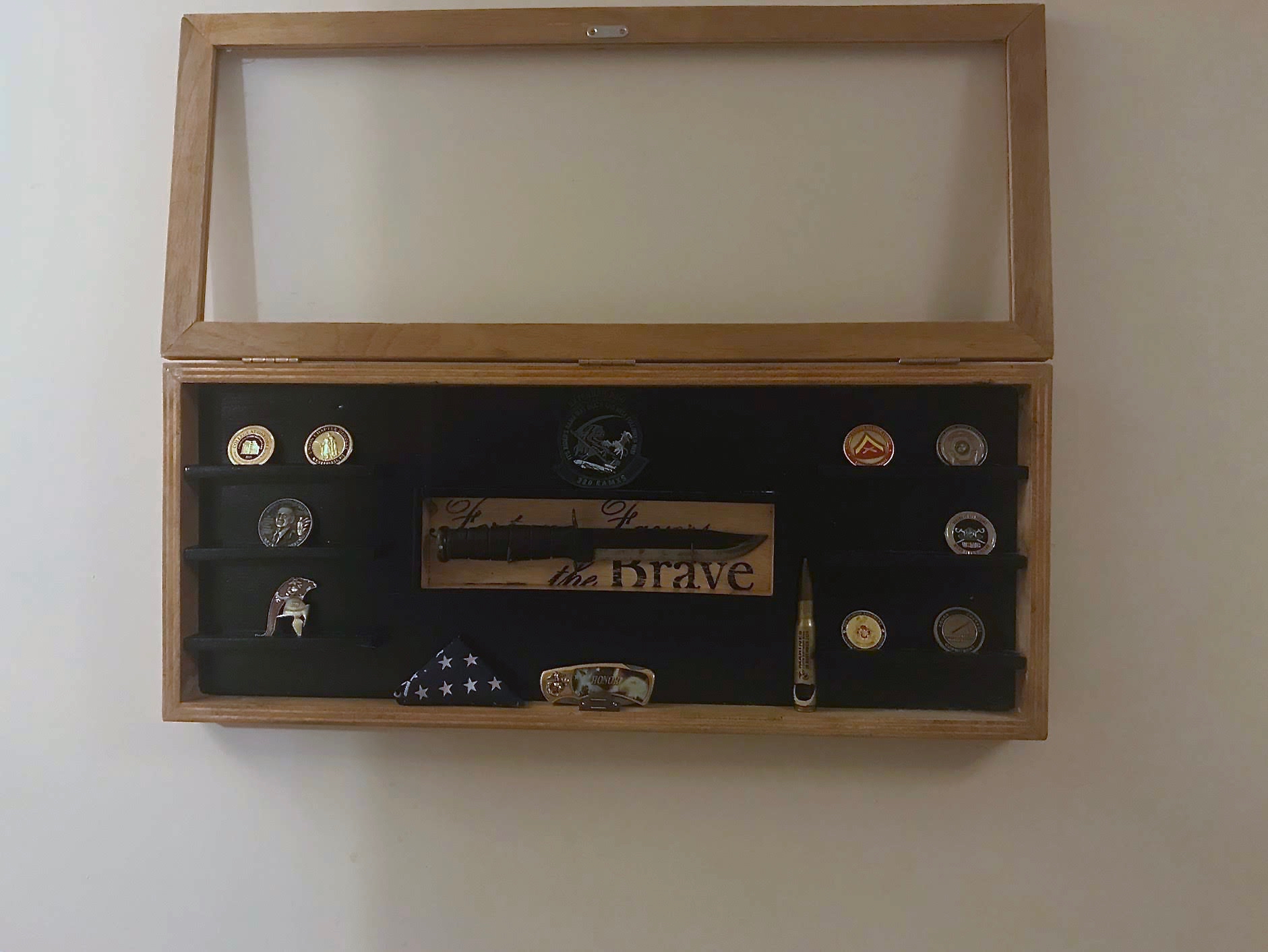 “Fortune Favors the Brave” challenge coin display (Combat Knife display optional)