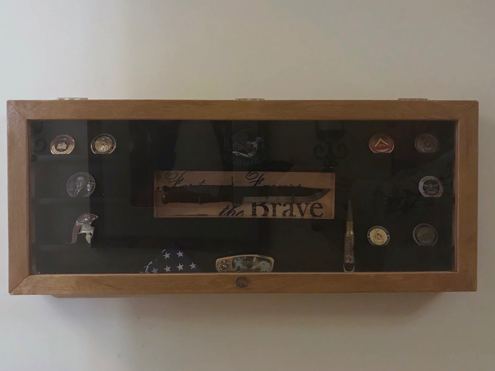 36×18 Display case with glass for any memorabilia. Includes safety glass panel that opens with top hinge. Stain and Paint options available. Can include place for military or hunting knife.